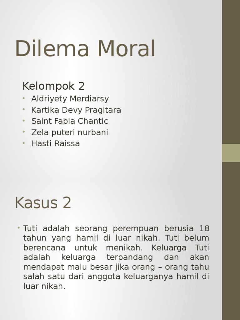 Issue Etik Dalam Pelayanan Kebidanan Ppt Download from slideplayer.info Inilah yang harus dimiliki setiap rumah, selamatkan punggung anda 🙂 saya akan menunjukkan kepada anda cara membuatnya sendiri. Singkat ceritanya kurang lebih begini: Dilema moral kerap terjadi di kehidupan bermasyarakat. Keputusan manapun yang diambil pasti memiliki resiko moral dan. Dilema moral adalah suatu keadaan di mana dihadapkan pada dua alternatif pilihan, yang kelihatannya sama atau hampir sama dan membutuhkan pemecahan masalah. Johnson (1990)menyatakan hal tersebut merupakan keadaan yang terdiri dari dua pi lihan yang seimbang,dengan kata lain, dilemma merupakan keadaan yang. Dilema trem atau kereta api adalah satu lagi klasik antara dilema etika / moral, yang dibuat oleh philippa foot. Studi tentang dimensi moral dalam feminisme membawa pertanyaan etika ke domain studi wanita.